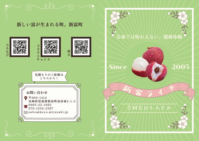 2017年4月に、持続可能な地域の実現を目指して宮崎県新富町が設立した地域商社です。「世界一チャレンジしやすいまち」というビジョンのもと、1粒1,000円ライチに代表される農産物中心のブランディングや商品開発で稼ぎ、得られた利益を人財育成に再投資しています。主幹事業である新富町ふるさと納税の運営では、2017年から2021年までの5年間で累計70億円の寄附額を記録しており、新富町と多様な企業との連携事業や生活利便性の向上に役立てられています。