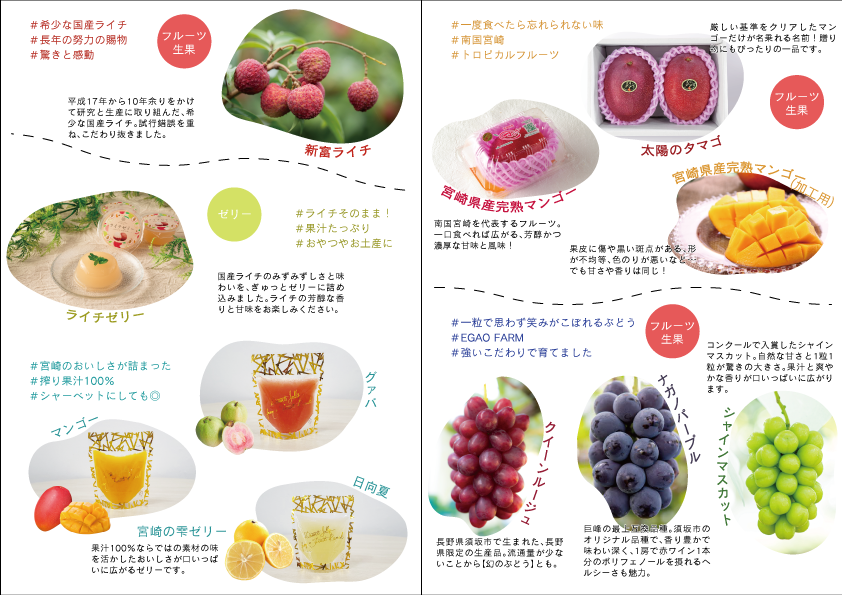 展示品はふるさと納税返礼品としても人気の「新富ライチ」を始めとした各種フルーツ・加工品となります。