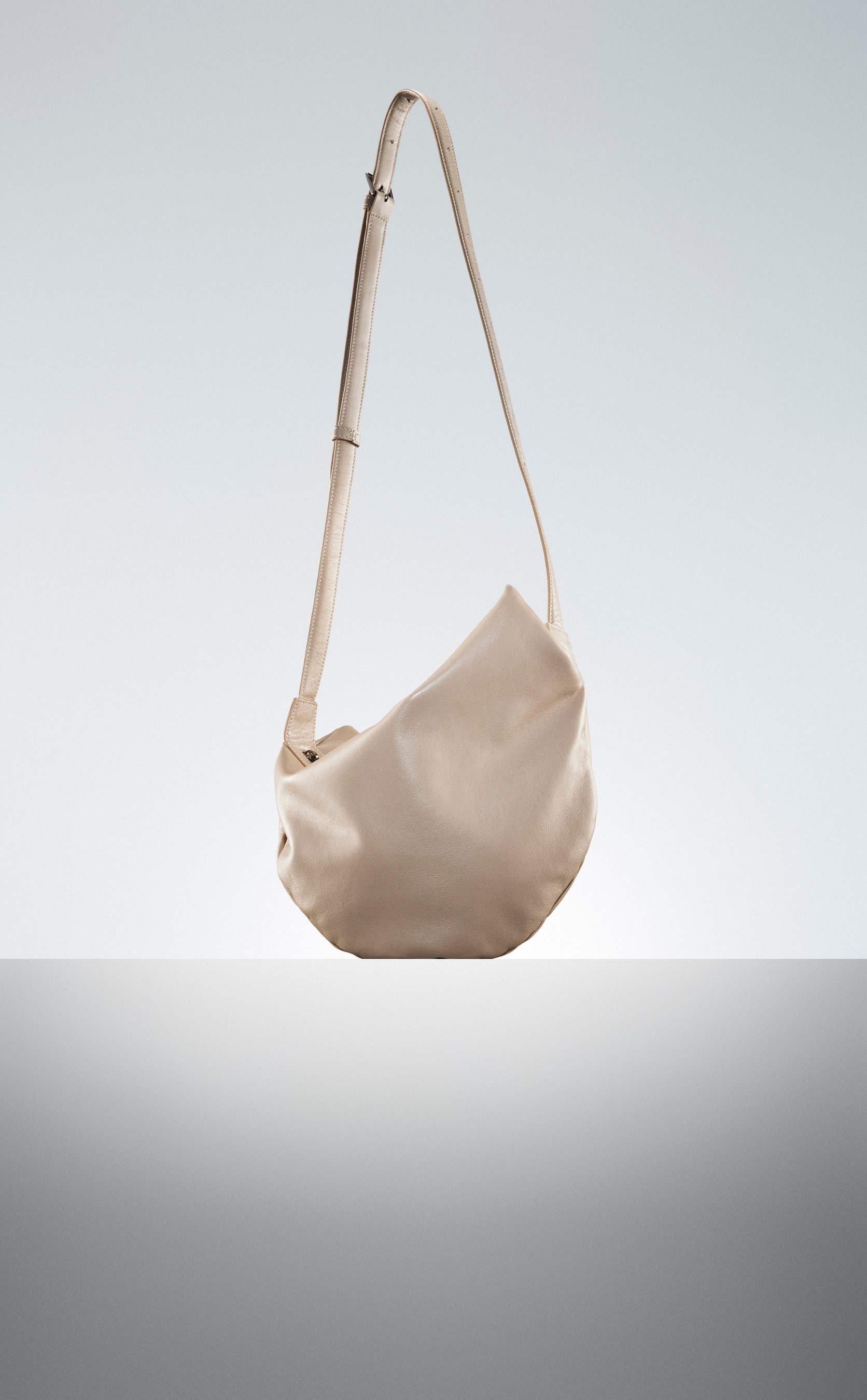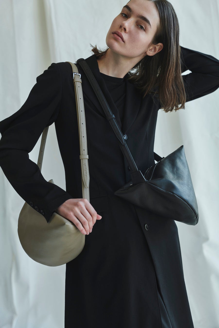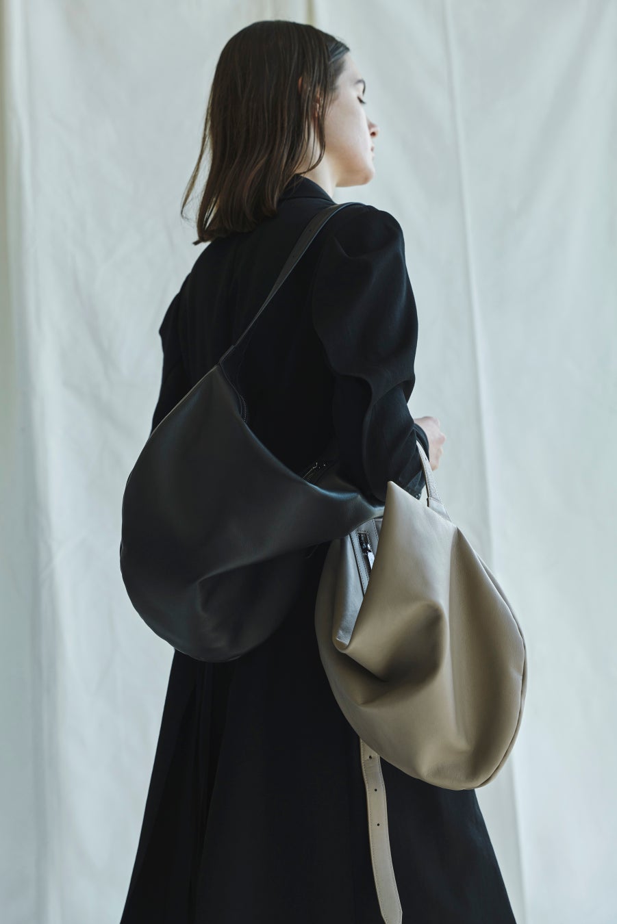 中に物を入れ、肩にかけるあるいは手に持った時にドレープが生まれる「ROUND」。優美なレザードレープがつくる有機的な陰影と、幾何学的な丸いラインのユニークなバランス。調整可能なストラップでスモールサイズはクロスボディもお楽しみいただけます。