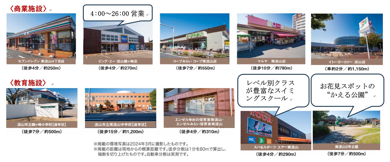 交通 : つくばエクスプレス「南流山」駅徒歩7分、JR武蔵野線「南流山」駅徒歩8分、流鉄流山線「鰭ヶ崎」駅徒歩8分