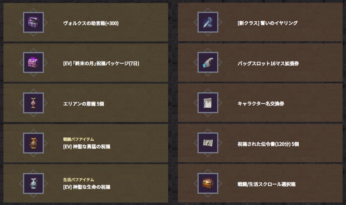 事前予約を完了すると、装備品の強化に役立つ「ヴォルクスの助言箱(+300)」の他、プレイに役立つバフアイテム「[EV] 神聖な勇猛の祝福」「[EV] 神聖な生命の祝福」などをゲーム内で即時獲得することができます。また、今回の新クラス実装時に追加でアバターアイテムの「[新クラス] 誓いのイヤリング」や、「バッグスロット16マス拡張券」「キャラクター名交換券」といったゲーム内アイテムを受け取ることができます。