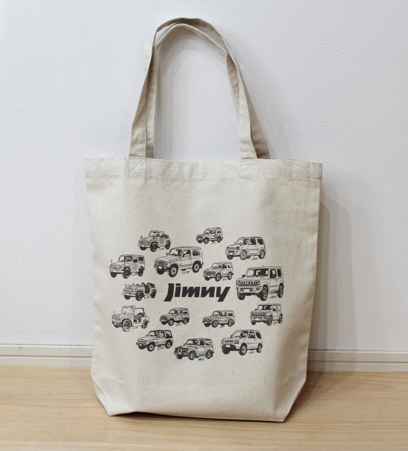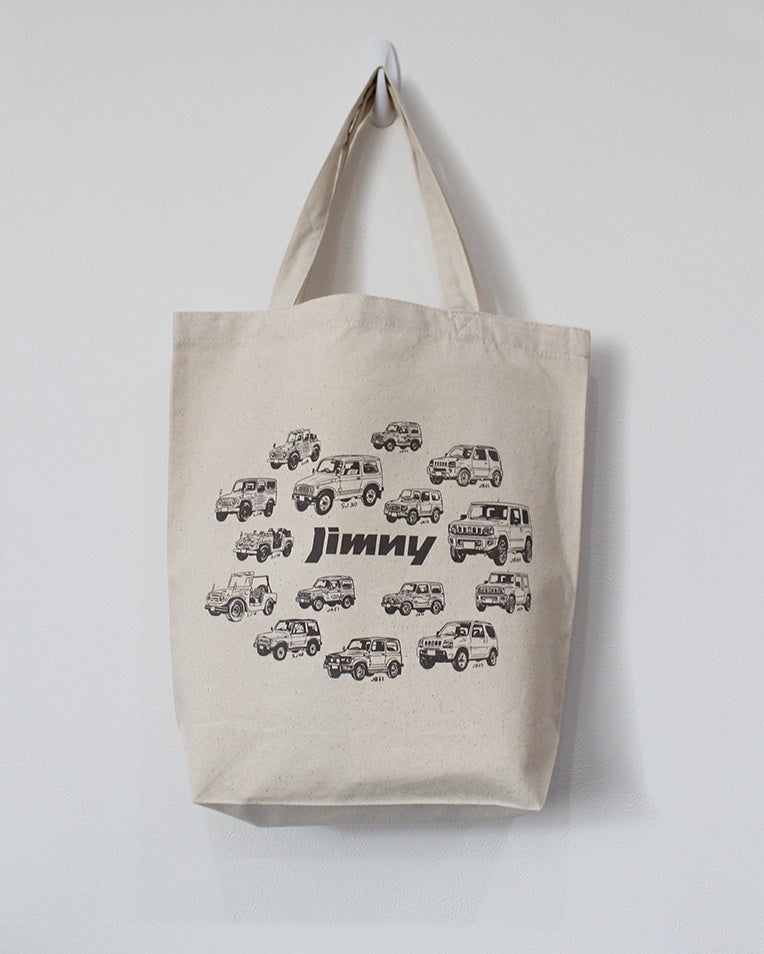 ジムニーぬりえトートは、キャンバス生地にぬりえのようなデザインのジムニーのイラストが入っています。