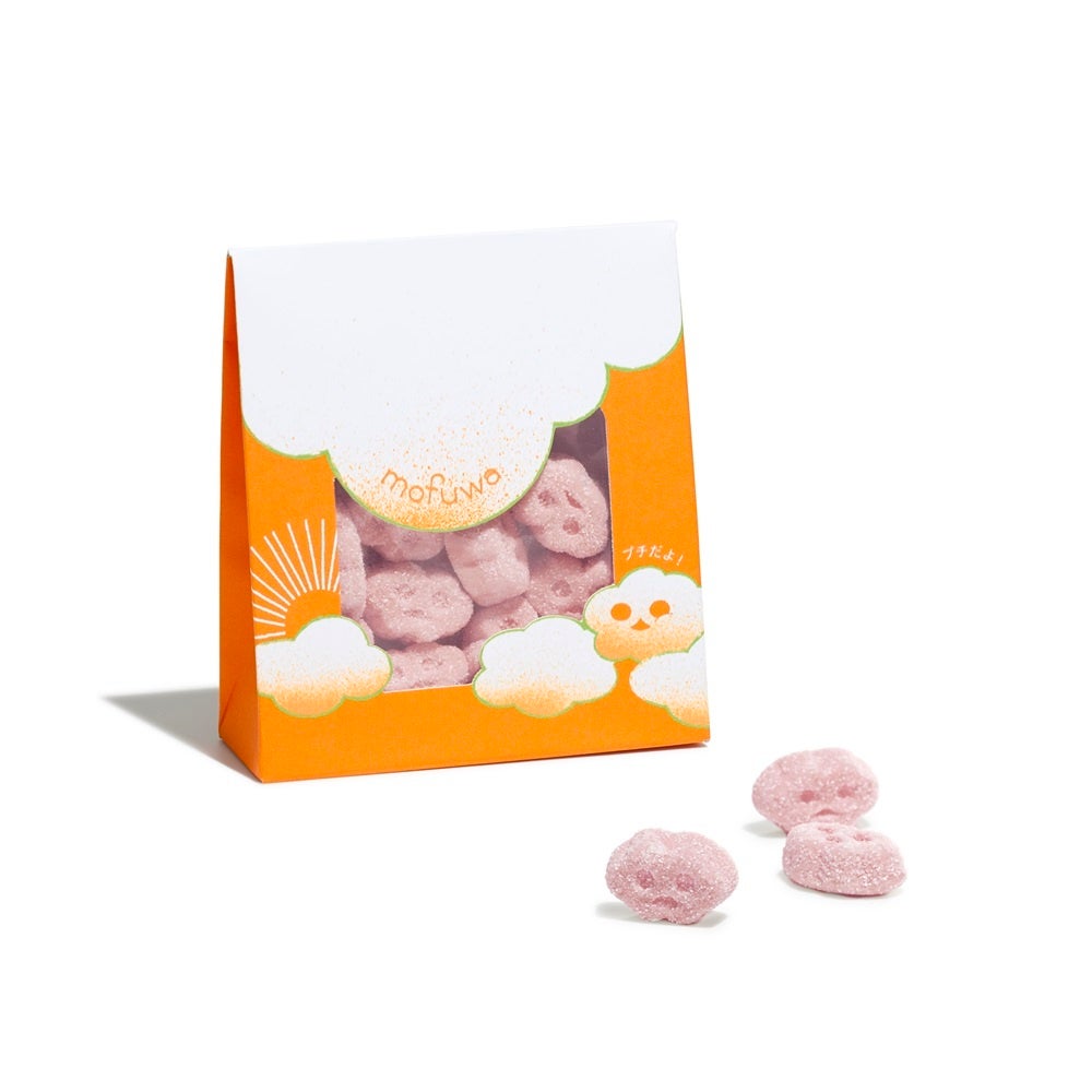 “もふふわ”食感が楽しめる雲形の「mofuwa」を一口サイズに小さくした、何とも言えない癒し系の表情が楽しいマシュマロです。ピンク色のいちごヨーグルト味の「mofuwaプチ」が夏の熱い太陽をイメージしたオレンジ色の明るいパッケージの窓からのぞく姿もかわいい商品です。