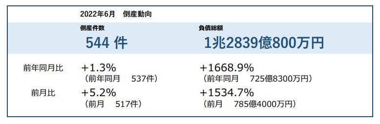 倒産件数は544件、2020年7月以来2年ぶりの2カ月連続増加 ― 全国企業倒産集計2022年6月報