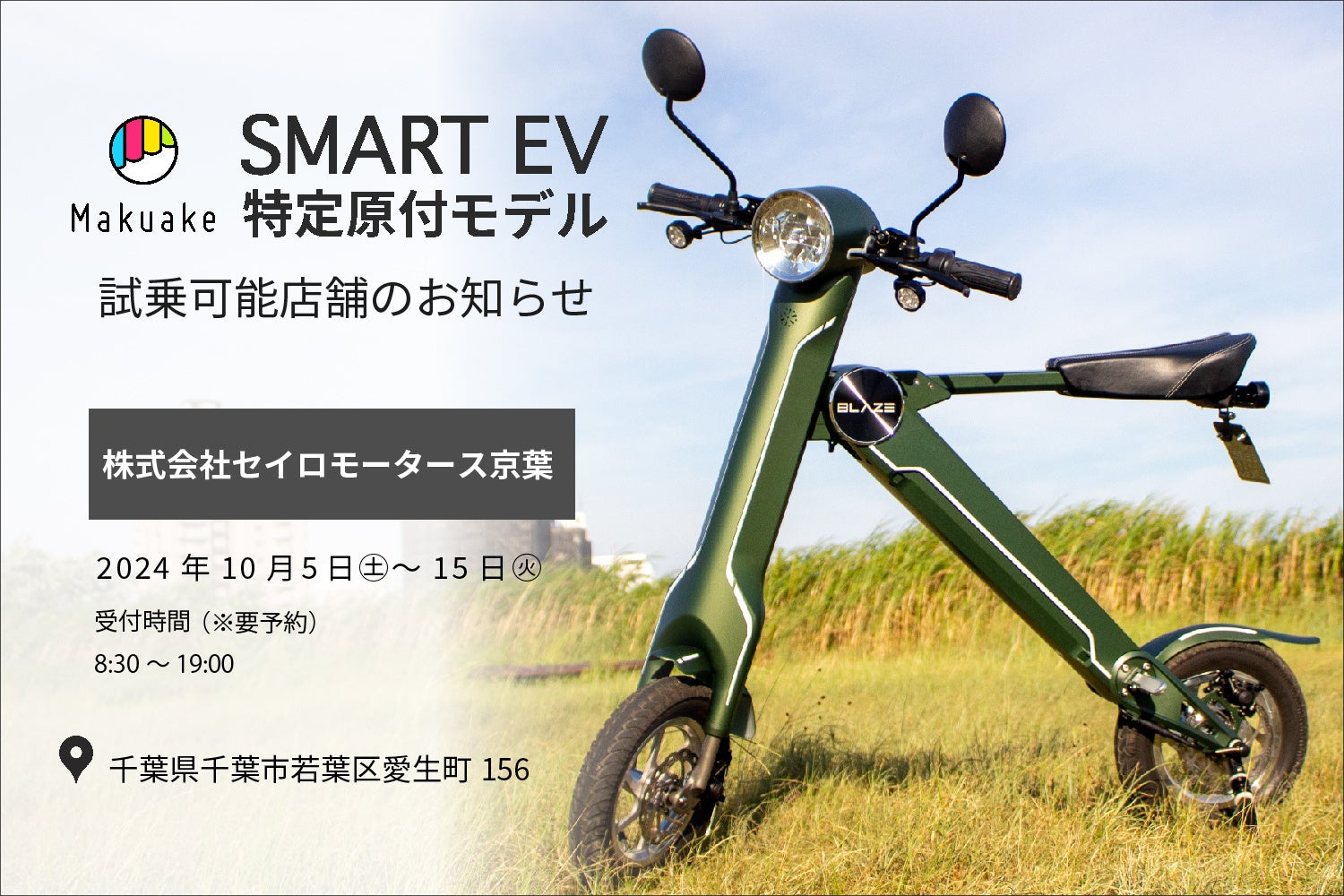 株式会社ブレイズ(愛知県名古屋市、代表取締役:市川秀幸、以下ブレイズ)は、Makuake応援購入プロジェクトにて先日発売した「16歳以上免許不要」の新商品:スマートEV 特定原付モデルが、弊社正規ディーラーの「株式会社セイロモータース京葉」(千葉県千葉市)にて、2024年10月5日(土)~15日(火)までご試乗いただけますことをお知らせいたします。