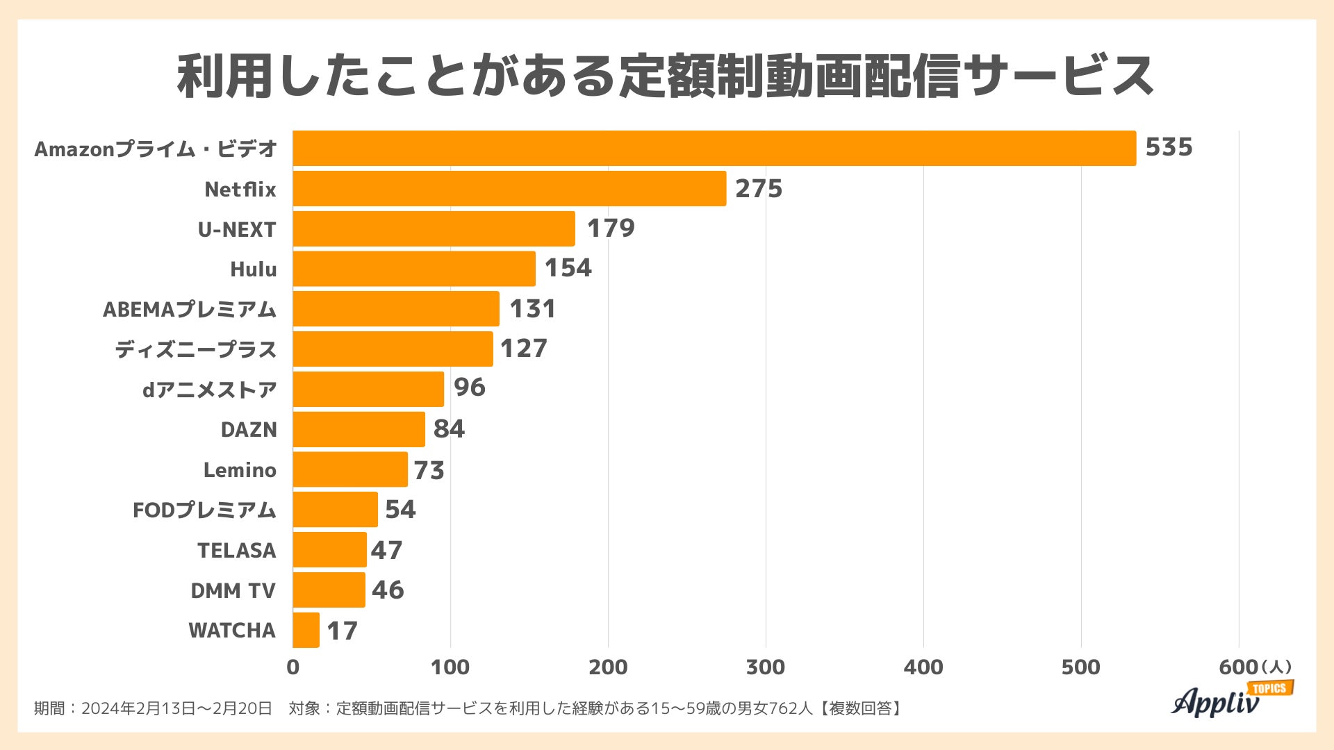 定額動画配信サービスを「現在利用している」「過去に利用したことがある」と回答した762人に、利用したことのあるサービスを尋ねると、1位は「Amazonプライム・ビデオ」で535人、2位は「Netflix(275人)」、3位は「U-NEXT(179人)」でした。