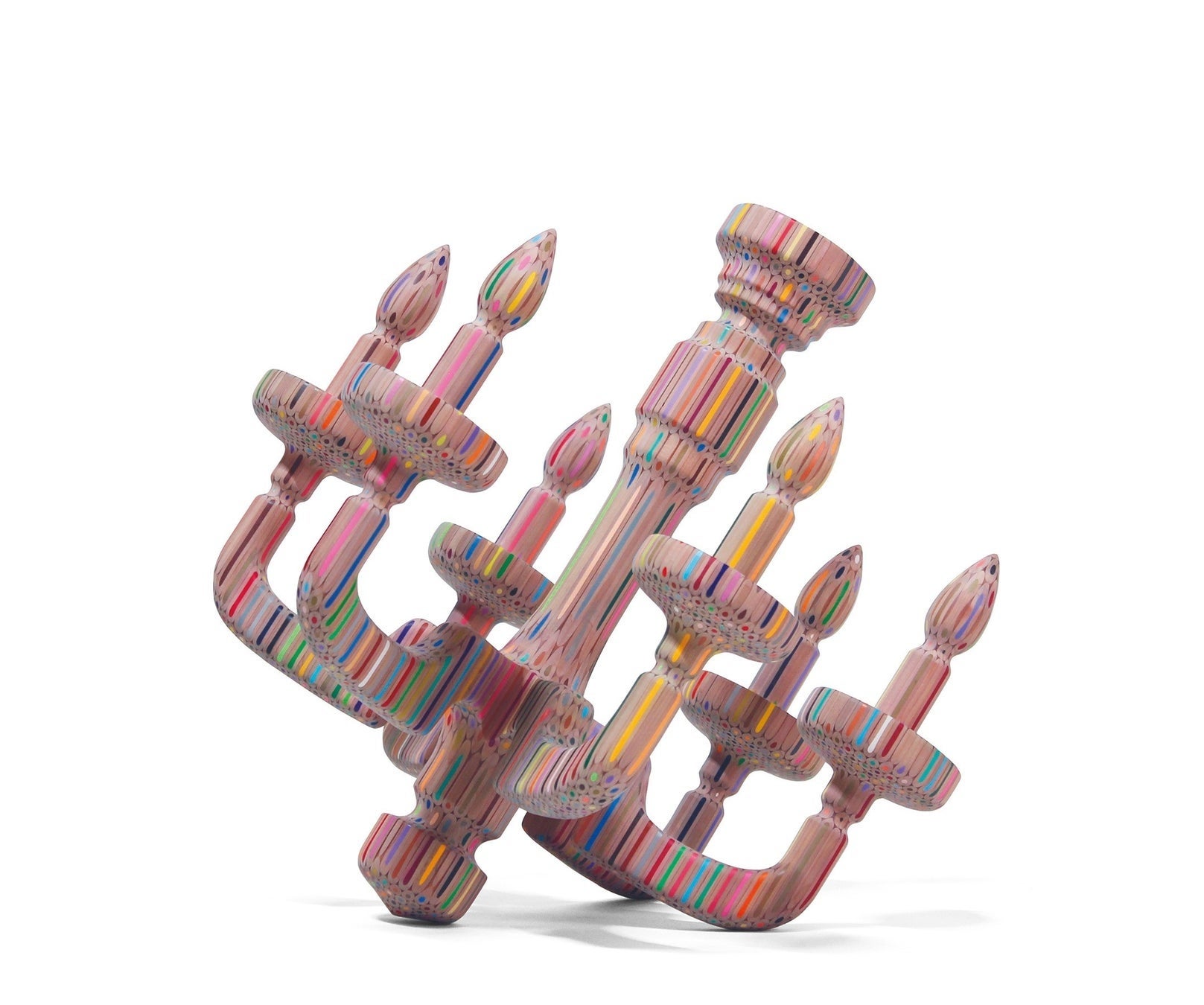 色鉛筆を樹脂で固めて「原木」に見立てた素材による「色鉛筆彫刻」作品を制作。