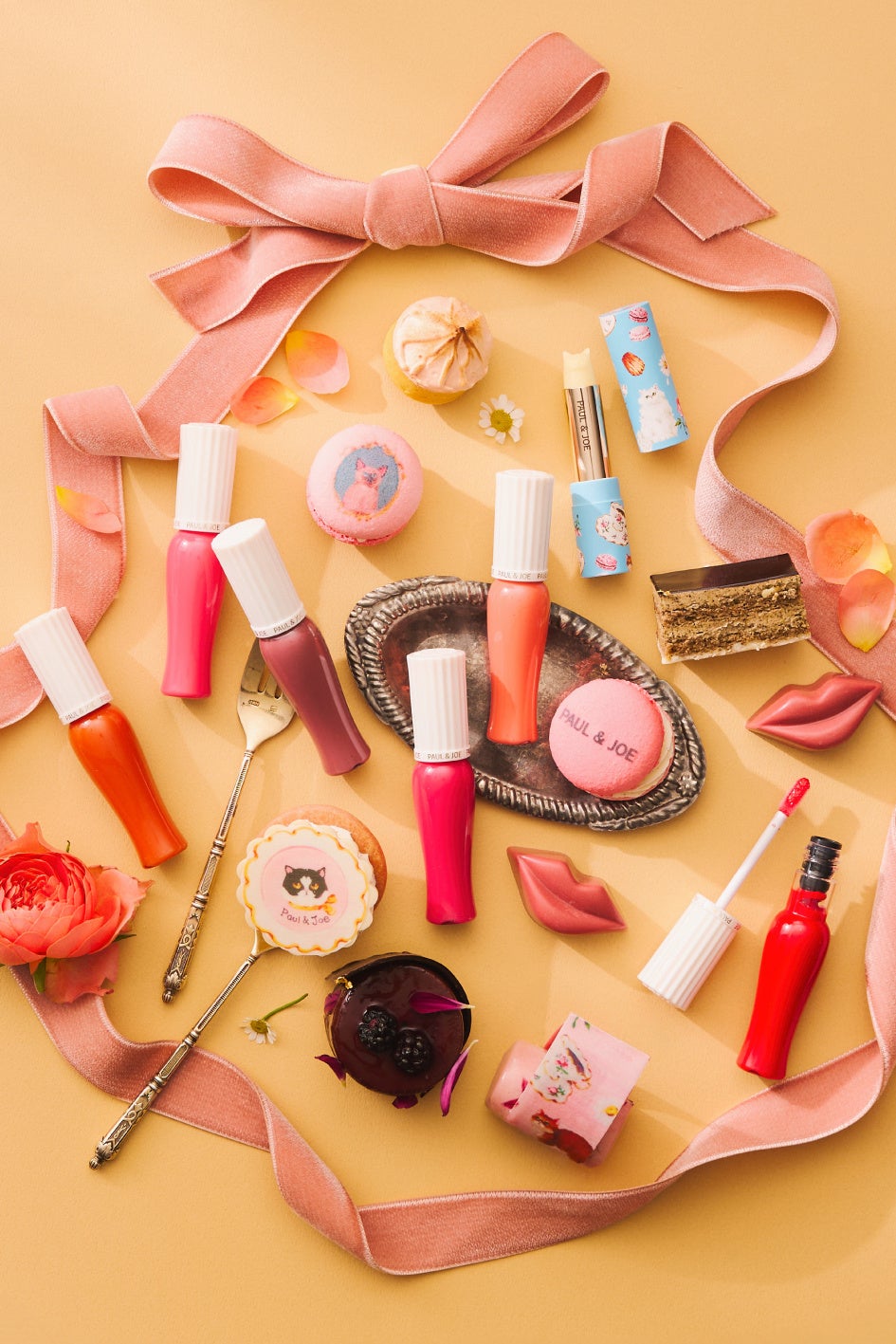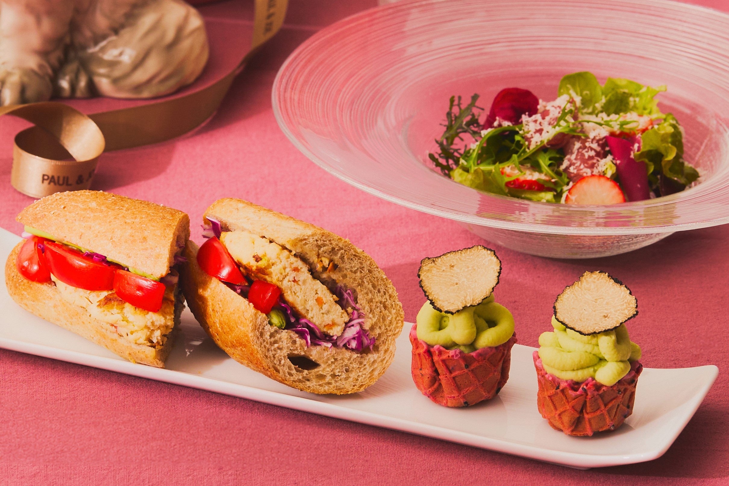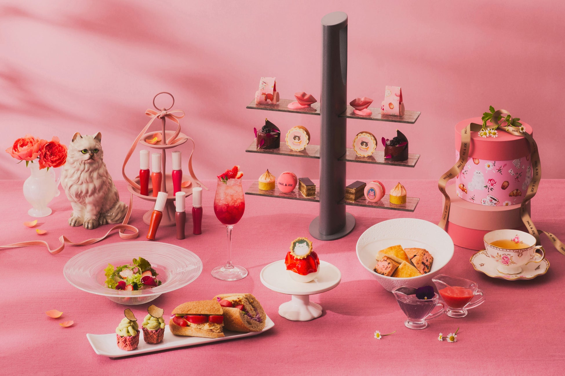 今回のアフタヌーンティーでは、“JOIE DE VIVRE”(生きていることの喜び)“に溢れたコレクションを展開するPAUL & JOEのエッセンスと、幸福感と温かみのあるレトロモダンなブランドの世界観にインスパイアされたスイーツをラインアップ。デザイナー ソフィーの愛猫のイラストをあしらい、大切な誰かへのギフトボックスをイメージしたストロベリームース「プチボヌール」や、猫たちから着想した「サブレサンド」など、世界中で愛されるPAUL & JOEのモチーフたちがスイーツとなり登場します。さらに、2025年春の新製品グロッシー ルージュとリンクしたスイーツもご用意。気品溢れるニュアンスカラーのボンボンショコラなど、同ブランドの魅力も表現しています。春らしいセイボリーやスコーン、20種類以上のフリーフロードリンクとともにお楽しみください。