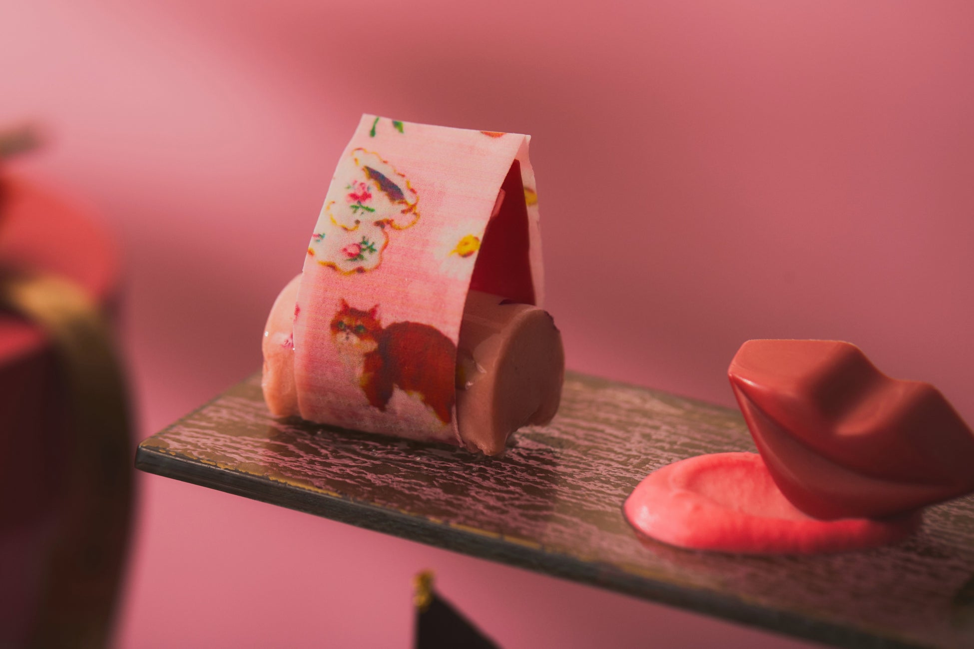 鮮やかで情熱的なレッドと、グロッシーな艶感が印象的でありながら、その下には優しい甘さのメレンゲボウルに、ストロベリーアイスクリームやフレッシュのいちごなどを詰め込みました。トップに飾った額縁から気まぐれな猫たちが顔を出す、心ときめく一品。
