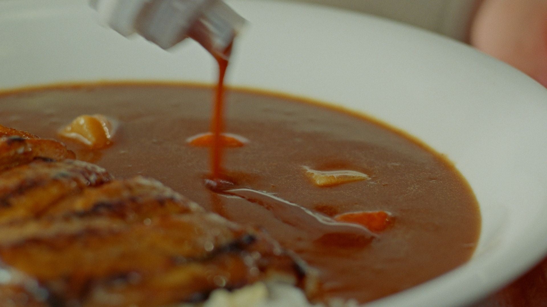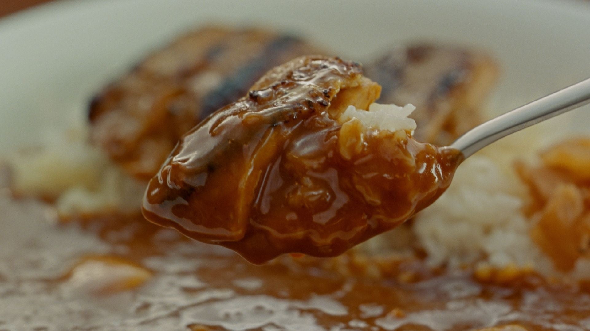 ソース!」とボトルを手に持ち、まずは1辛※分の“特製辛口ソース”をかけます。マイルドな味わいの新カレーが本格カレーに様変わりしたことに驚いた様子の石原さん。次に、「2辛の前の!私は1.8辛!」と自分好みに辛さを調節してみせます。「楽しいこれ!」と、辛さ自由自在の新カレーにワクワクする石原さんと、新カレーを通して生まれる、石原さんと男の子の楽しげな食事風景にぜひご注目ください。