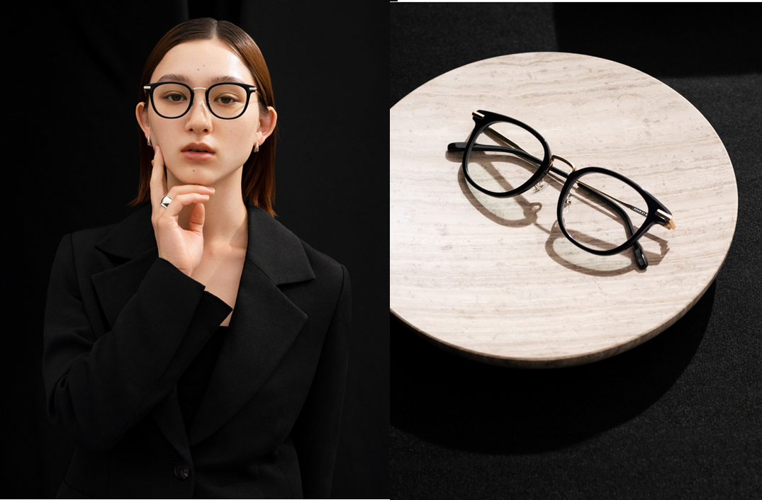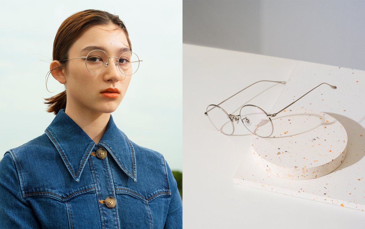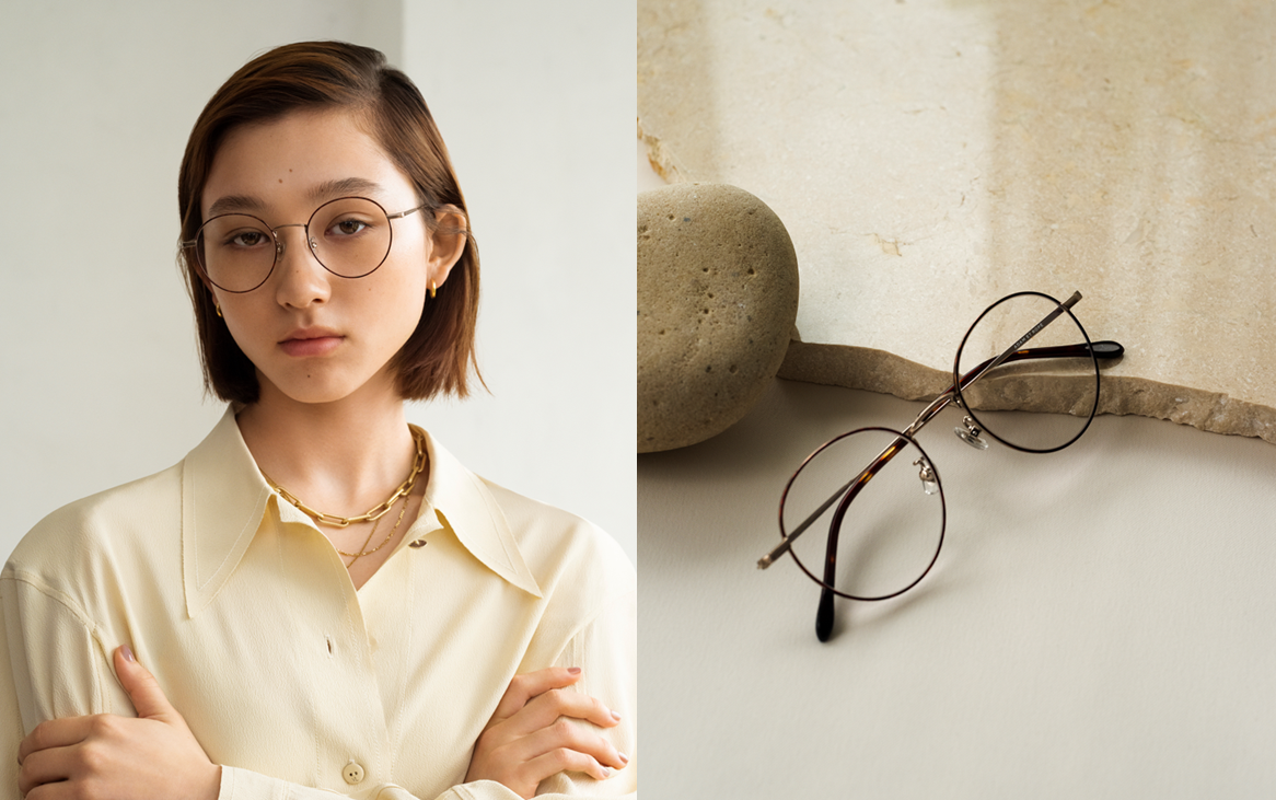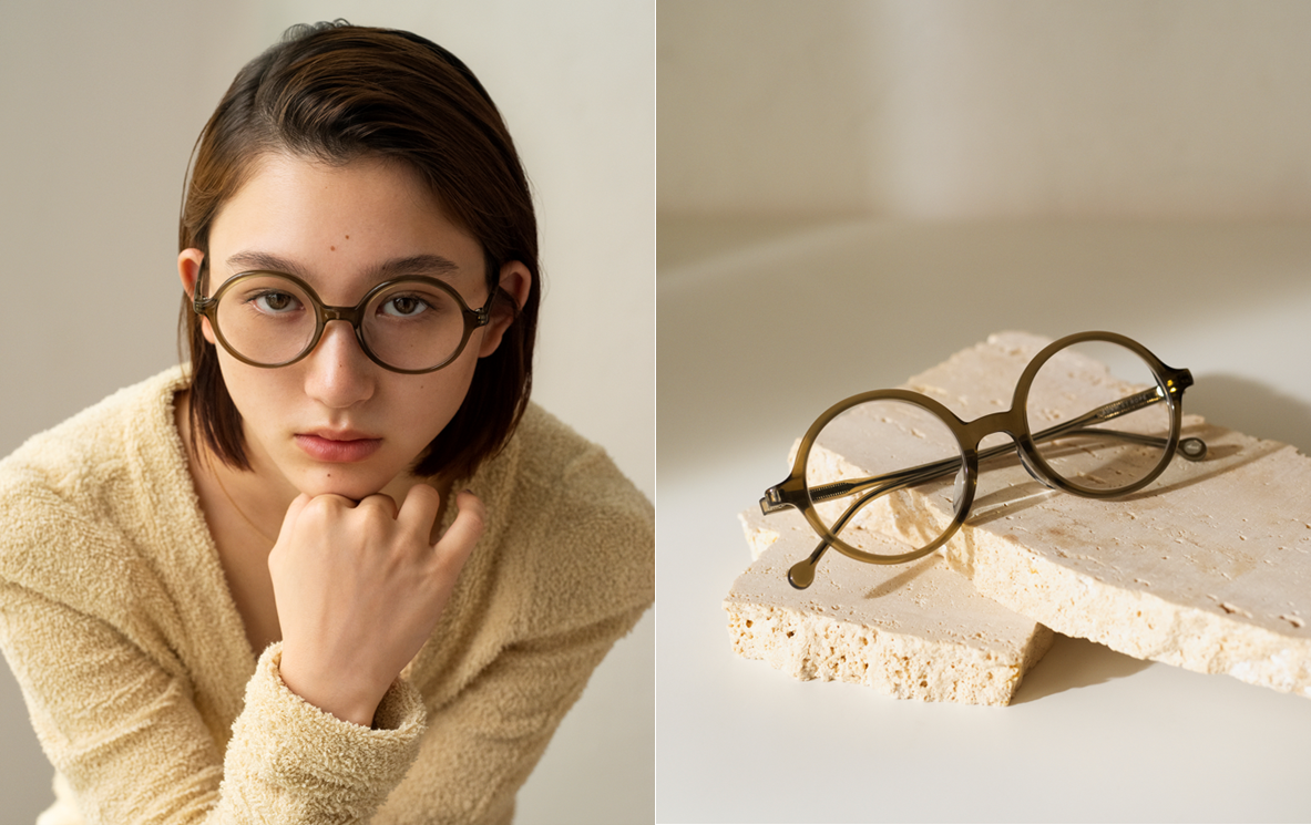 セルのラウンドフレームをあえて大きめに仕立てることで、肩の力が抜けた大人のリラックスムードに。