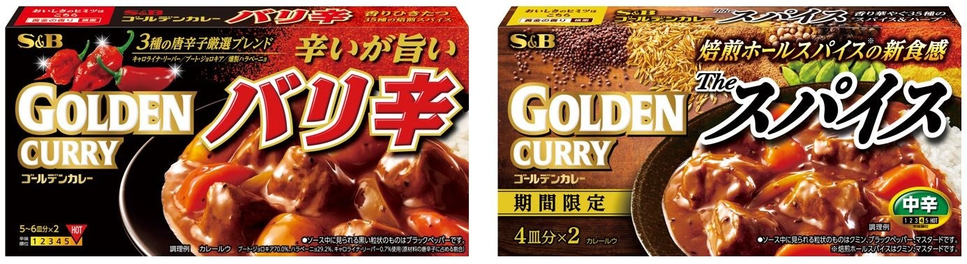 エスビー食品株式会社は、35種のスパイスとハーブが香る「ゴールデンカレー」から、辛さと旨さを引き立てる唐辛子と焙煎スパイスの香りが調和した「ゴールデンカレーバリ辛」をリフレッシュし、焙煎ホールスパイスの豊かな食感と広がる香ばしさが味わえる「ゴールデンカレーザ・スパイス 中辛」を期間限定で新発売します。