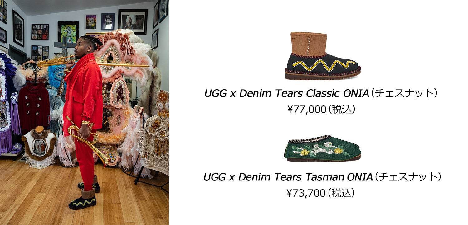 エモリーは、UGGの2スタイルを自身のユニークな歴史のレンズを通して再解釈しています。UGG x Denim Tears Tasman ONIA(UGG x デニム ティアーズ タスマン オニア)は、UGGを代表する素材のスエードとシープスキンを使用し、花をあしらったパネルと履き口周囲をかがり縫いのディテールで仕上げたスリッポン。UGG x Denim Tears Classic ONIA(UGG x デニム ティアーズ クラシック オニア)は、UGGブランドのアイコンに刺繍とビーズをあしらい、エモリー自身の文化を融合させています。このブーツもUGGを代表する素材のスエードとシープスキンを使用し、かがり縫いのディテールで仕上げています。 本コレクションは、UGG銀座、大阪店、UGG公式サイト( https://bit.ly/3ssXjtX )、およびGR8とNUBIANにてご購入いただけます。