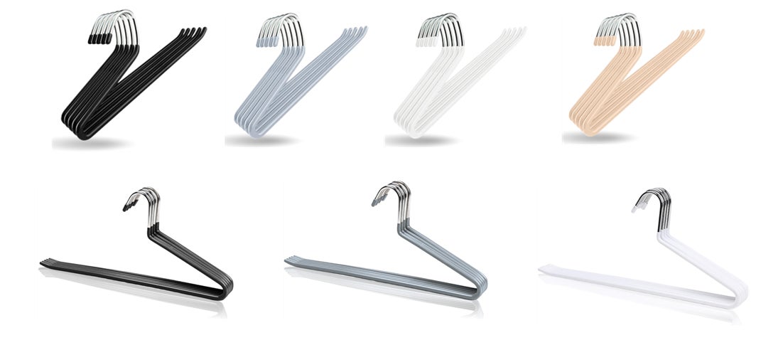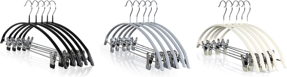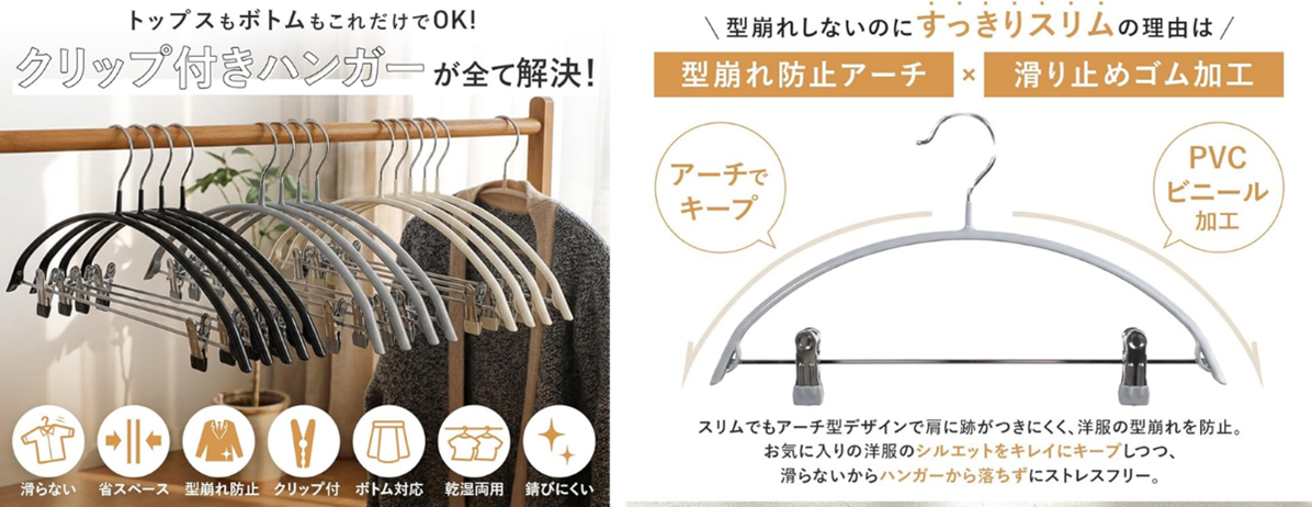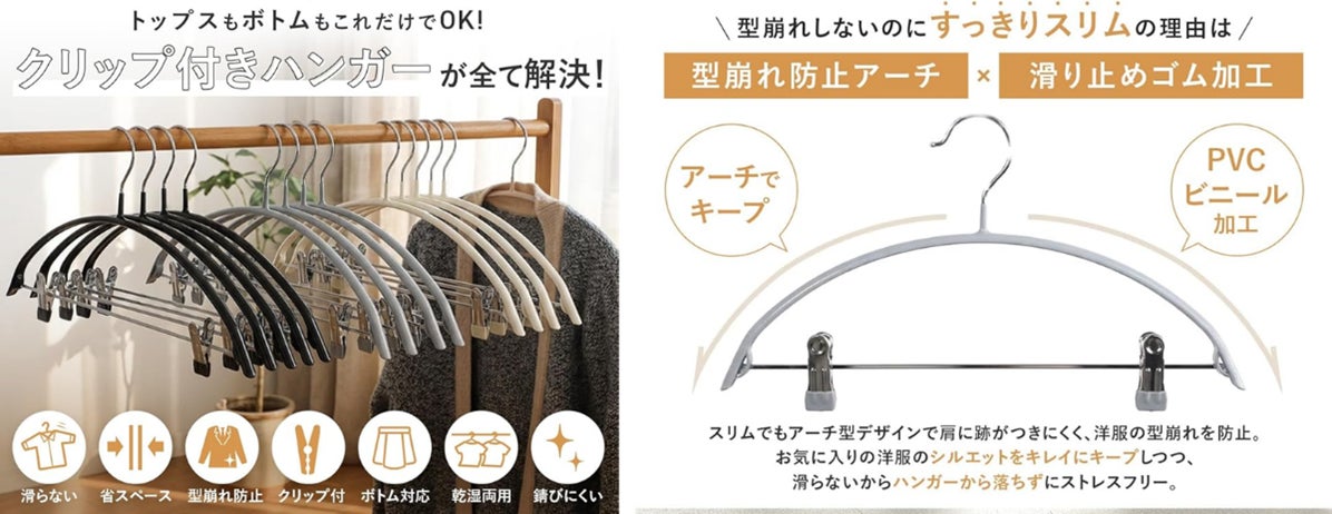 従来のアーチ型ハンガーにクリップを備えた新タイプを追加いたしました。トップスだけでなくボトムスも1本で掛けられるようになり、ハンガーの掛け替えや種類を使い分ける手間を減らします。