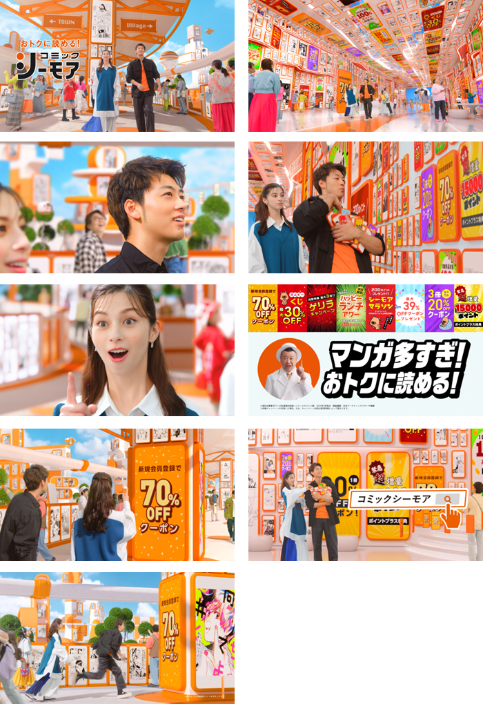 シーモアタウンを散策している兄・竹内さんと妹・中条さんが新しいエリアに辿り着くシーンからCMはスタート。マンガだらけの空間の中で、妹・中条さんがクーポンを発見します。すると、兄・竹内さんが抜け駆けするように「いただき!」とクーポン画面に吸い込まれるようにイン。妹・中条さんも後を追うようにクーポン画面に入っていきます。あたり一面クーポンだらけのクーポンゾーンにワープした兄妹は、目を輝かせながら壁にかかったクーポンをここぞとばかりに取り合い、手に入れたクーポンでお得にマンガを楽しみます。
