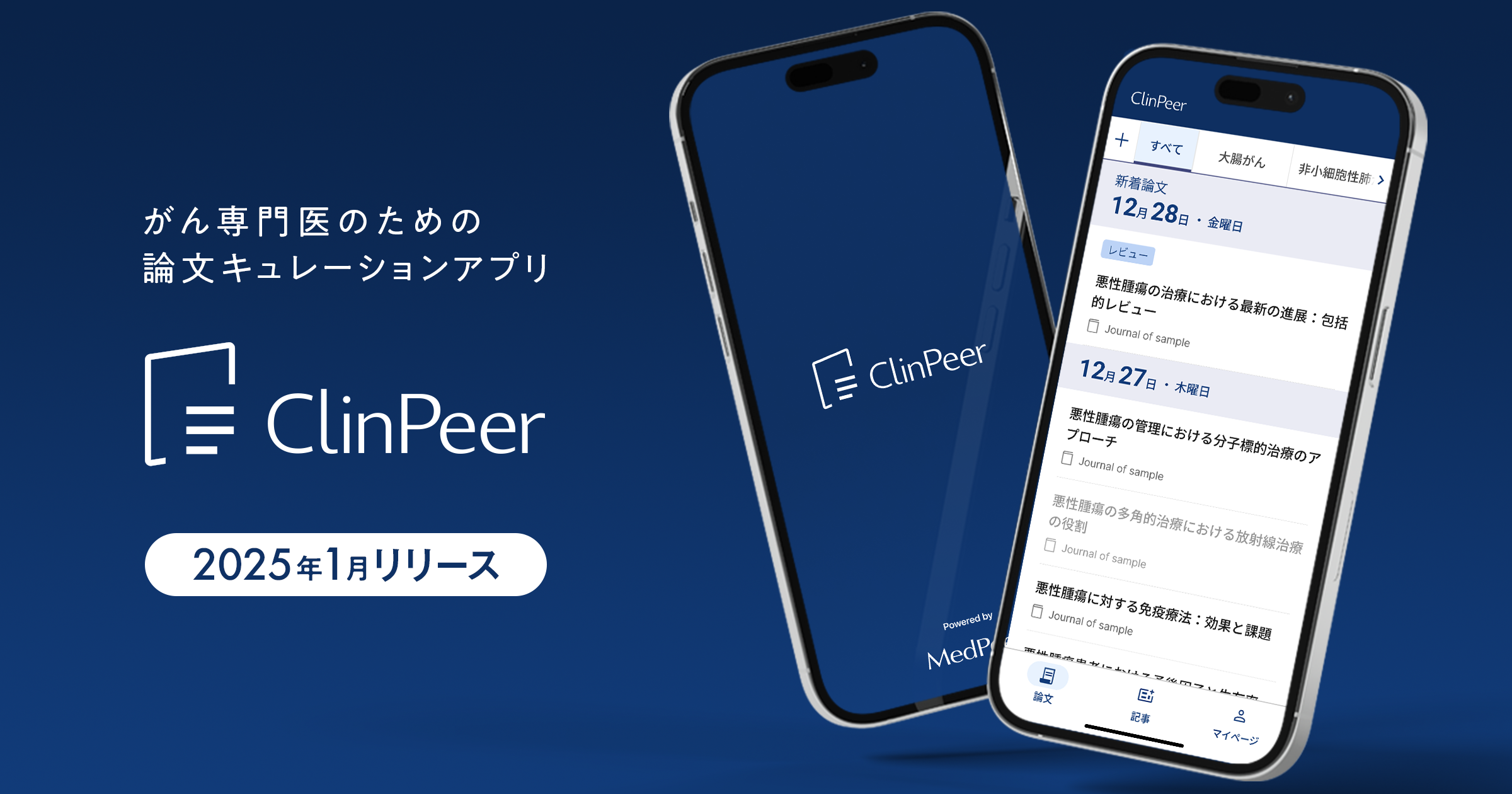 メドピア株式会社(東京都中央区、代表取締役社長 CEO:石見 陽、以下メドピア)は、がん専門医のための論文キュレーションアプリ「ClinPeer」を2025年1月にリリースします。14領域46カテゴリ※1に細分化したがん種ごとに、全世界の最先端の論文を専門医の協力のもと作成した独自の検索式・重みづけでキュレーションし、日本語要約とともに提供します。さらに重要論文については各領域の専門医による「論文解説」をお届けするほか、臨床解説コンテンツなども配信予定です。スマートフォンアプリ(iOS/Android)で提供することで、専門医が日々蓄積される最先端の研究成果を効率的にキャッチアップすることをサポートいたします。