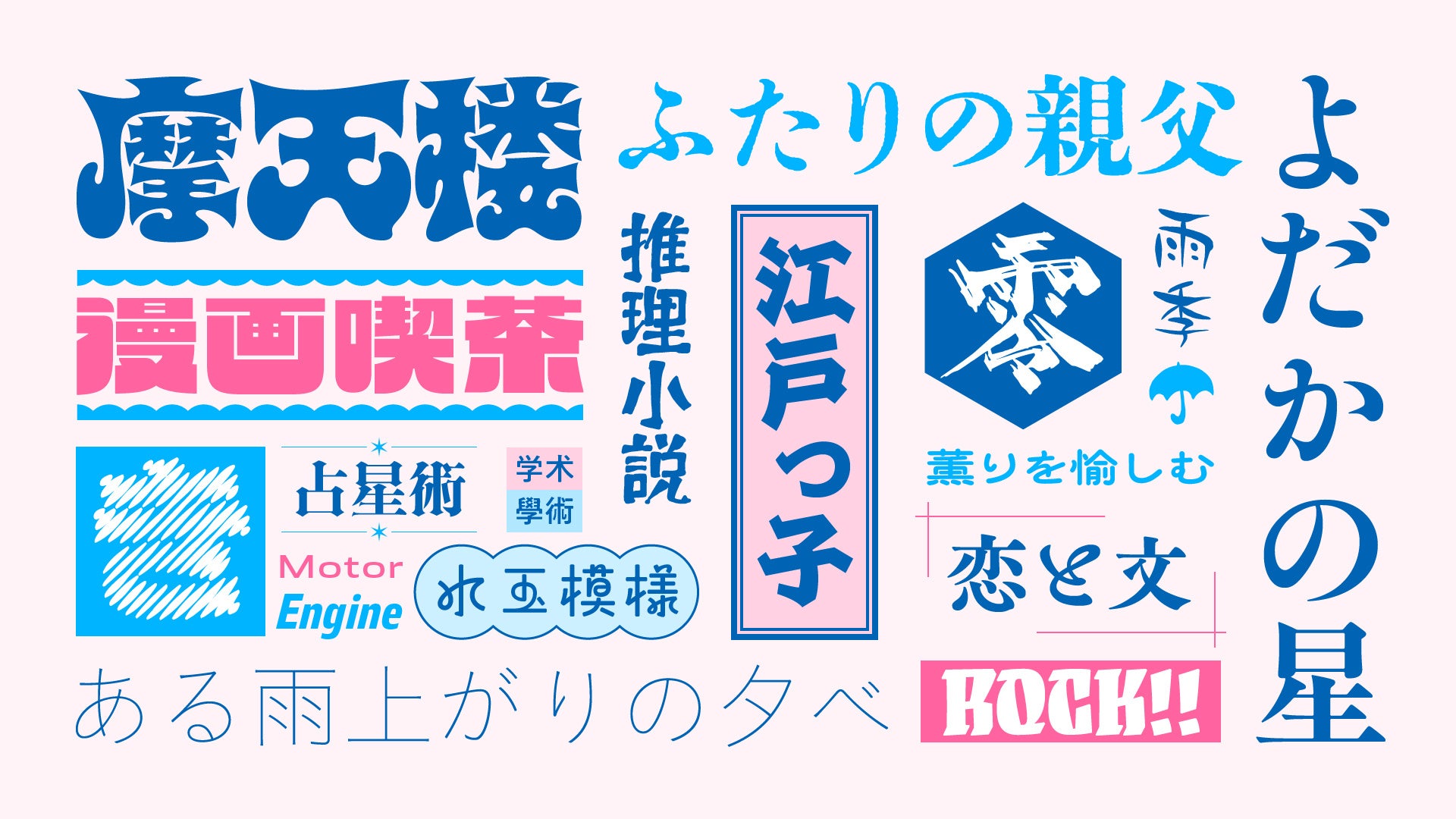 2024年度新書体では、サイケデリックなアートや音楽からインスパイアされた極太の「虹蛸天国(にじたこてんごく)」のほか、丸い輪のような装飾が楽しげな印象を与える「はるかぜ」、江戸文字からインスパイアされた「てやんでぇ」など、世界観づくりにぴったりなデザイン書体をリリースします。さらに書家による毛筆の文字が元となった「花氷(はなごおり)」など、華やかな筆文字系デザイン書体の選択肢が広がります。明朝体には、2023年にリリースした「欅(けやき)明朝 Oldstyle」の見出し書体「欅見出明朝」や、人気の「秀英にじみ」シリーズから「秀英にじみ初号明朝」などを新たに追加します。ユニークなファミリー展開が特徴の「Heavy」シリーズなど、デザインに彩りを加える特色豊かな欧文書体にも注目です。
