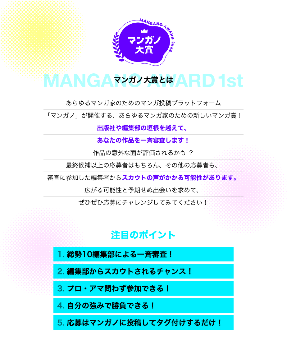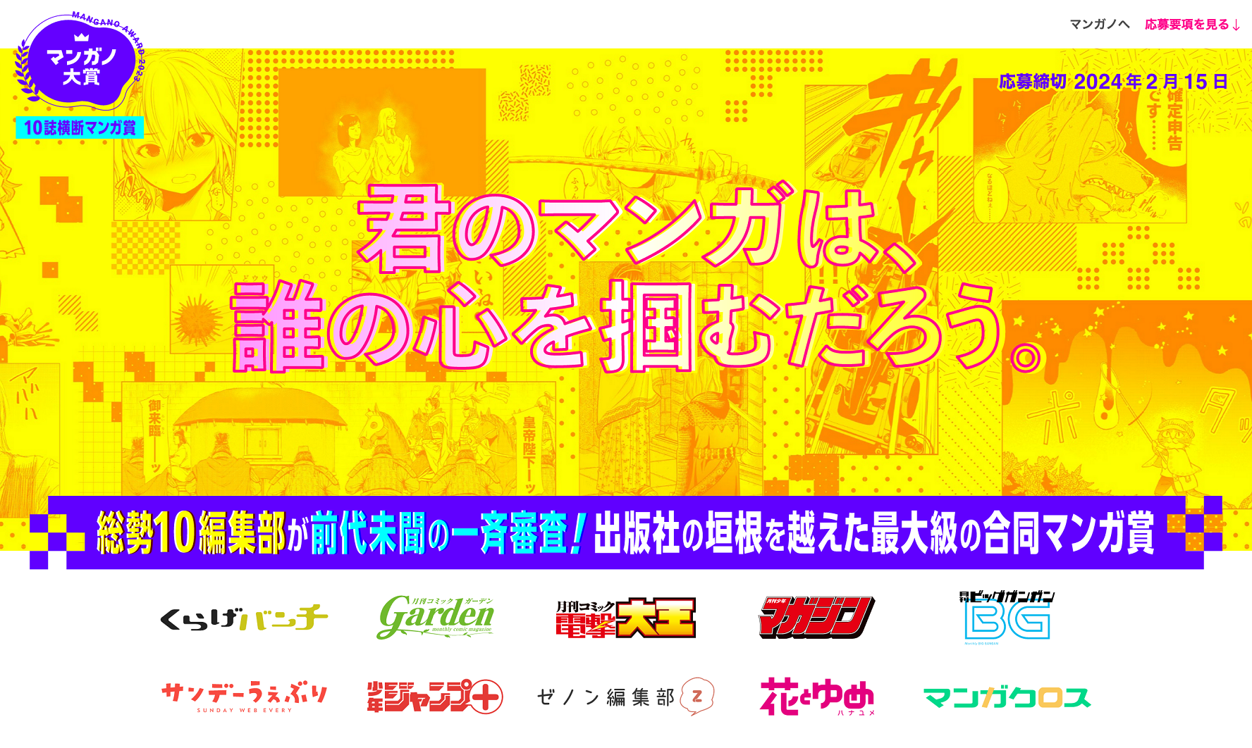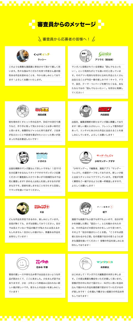 KADOKAWA、講談社、小学館、スクウェア・エニックス、集英社など10社の計10編集部が一斉審査に参加するマンガ賞で、大賞に選出された方には賞金200万円を授与します。また、受賞の有無を問わず、応募作品はすべてスカウトの対象となり、10社10誌のさまざまな編集者から、スカウトの声がかかるチャンスがあります。「君のマンガは、誰の心を掴むだろう。」をキャッチコピーに、出版社や漫画誌のジャンルの垣根を越え、キラリと光る才能を発掘すべく審査いたします。