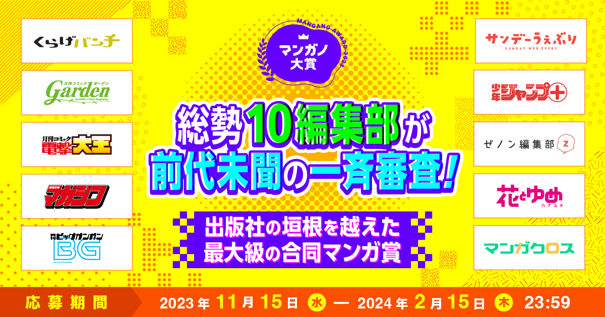 マンガ投稿プラットフォーム「マンガノ」にて、出版社や編集部の垣根を越えて10社10編集部が参加する前代未聞のマンガ賞創設。講談社、小学館、集英社など参加編集部が一斉審査&各誌からスカウトされるチャンス