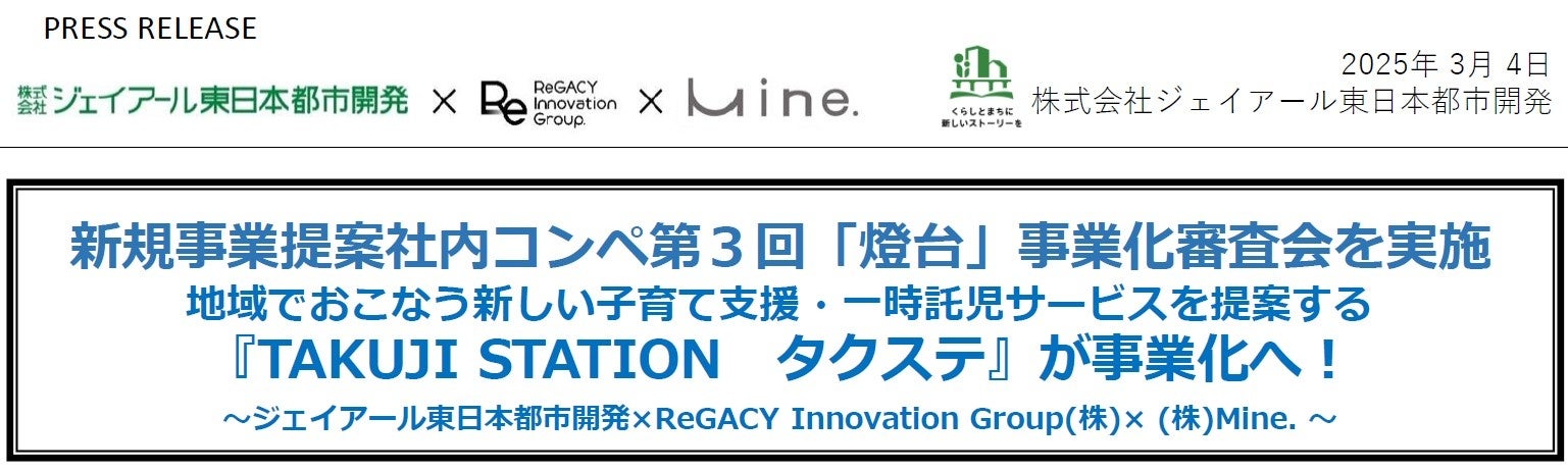 株式会社ジェイアール東日本都市開発とReGACY Innovation Group㈱は、ジェイアール東日本都市開発の新規事業提案社内コンペ第3回「燈台」における事業化審査会を実施し、2025年2月4日(火)『TAKUJI STATION タクステ』が、事業化することを決定いたしました。