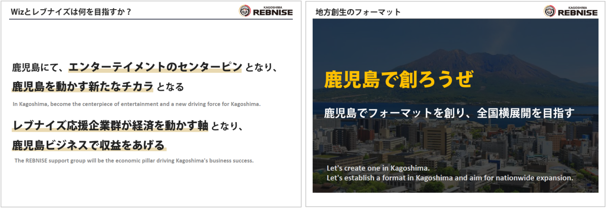 当社の代表取締役社長・山崎からは「鹿児島レブナイズ センターピン構想とは?」をテーマに、「鹿児島レブナイズをエンターテイメントのセンターピンに立て、鹿児島を動かす新たなチカラとする」「鹿児島で地域創生のフォーマットを創り、全国に横展開を目指す」という考えや、鹿児島に関連する新規事業についてご紹介しました。