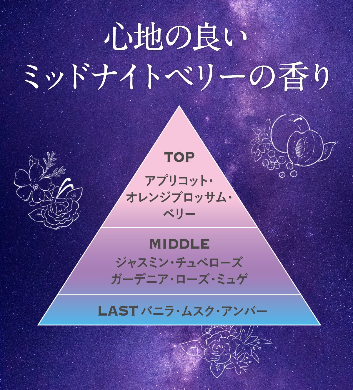 みずみすしいフルーツとやさしいフローラルの香りが心地よいムーンライトベリーの香りに包まれながら、翌朝毛先までうねりのないリッチなうるおい髪に導きます。