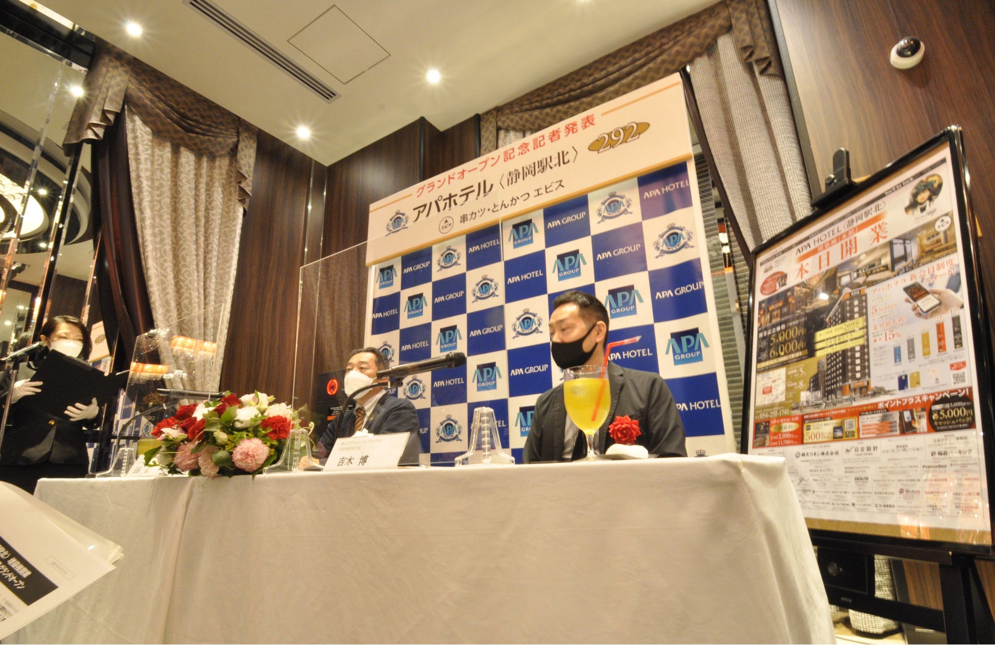 記者発表では、アパグループ社長 兼 最高経営責任者(CEO)元谷 一志が「約3年前の2019年3月にホテルを買収し、リニューアルオープンさせた。その際に隣地に大きな土地を見つけたことをきっかけに、土地所有者と交渉した結果、その場所に180室のホテルを増築できたことで、ほぼ3倍の客室数となるホテルを実現できた。政令指定都市である静岡市は、観光やビジネス需要の可能性も期待できる場所であり、現在は直営、FC、アパ直参画ホテルの合計で17ホテルを展開しているが、機会があれば今後も店舗を拡大していきたい。コロナも収束に向かいつつあり、各地で県民割の制度も出てきたことで地元の熱量を感じられるようになってきた。ウィズコロナの時代を迎え、コロナ前と変わらない人数の訪日観光客が訪れようになることを期待したい。アパホテルは常にイノベーションを行っている。新しい進化ポイントを取り入れ続けることで、お客様が楽しめ、新しい発見と刺激を持って帰ることができるホテルをこれからも提供していきたい。」と述べた。