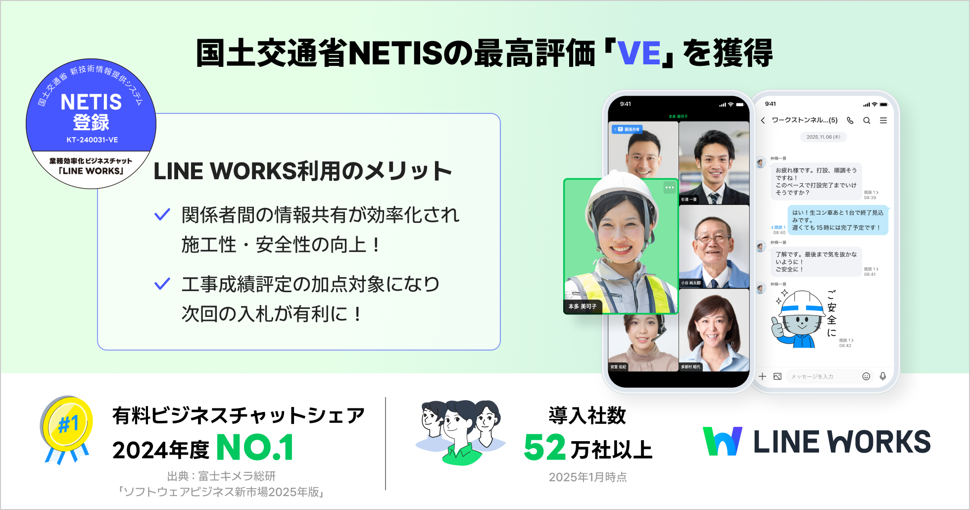ビジネスコミュニケーションツール「LINE WORKS」、建設現場DXで国交省技術評価「NETIS」の最高評価「VE」を獲得