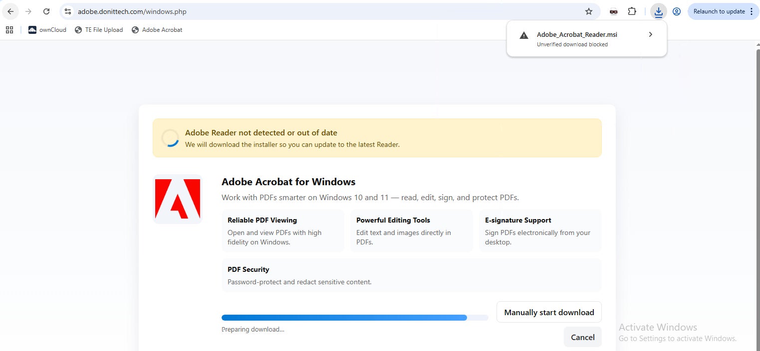 CPRは、「adobe[.]donittech[.]com/windows[.]php」にホストされた、Adobe Acrobatを装うフィッシングサイトを発見しました。このドメインは2025年11月に登録されており、サイトでは、悪意あるMSIファイルをダウンロードするようユーザーを誘導します。このファイルは、リモートアクセス型トロイの木馬(RAT)として悪用されるConnectWiseソフトウェアをインストールし、攻撃者が感染した端末を遠隔操作することを可能にします。