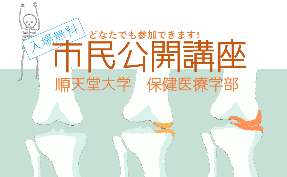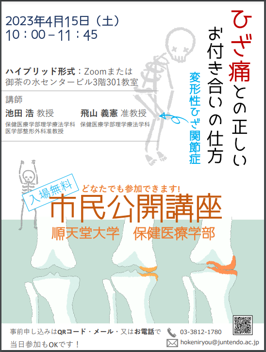 順天堂大学保健医療学部による市民公開講座「ひざ痛(変形性ひざ関節症)との正しいお付き合いの仕方」を2023年4月15日(土)に開催します。皆様のご参加をお待ちしております。