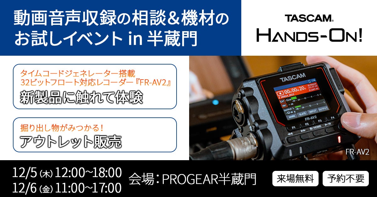 TASCAM(タスカム)は、2024年12月5日(木)~6日(金)に東京都千代田区にある株式会社システムファイブ PROGEAR半蔵門にて『TASCAM HANDS-ON! In半蔵門 System5』を開催いたします。