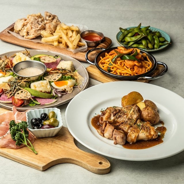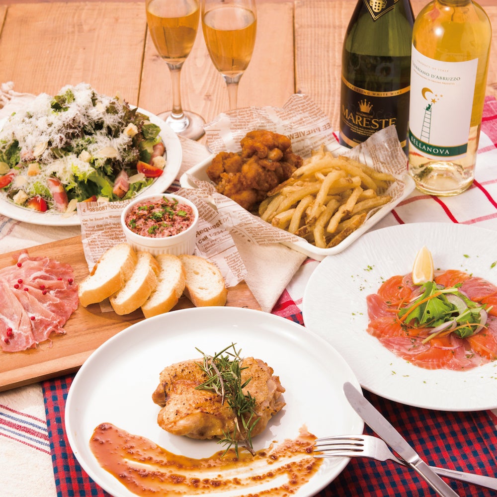 生ハム盛り/アンチョビとクリームチーズのポテトサラダ/和野菜と彩り野菜の和風グリーンサラダ/ローストビーフとアボカドのWASABIマリネ/ベーコンとローズマリーのフライドポテト/グリルチキンステーキ ~赤ワインソースで~