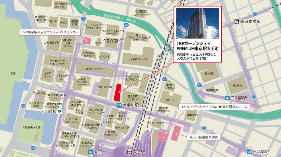 「TKPガーデンシティPREMIUM東京駅大手町」は、東京メトロ・都営地下鉄各線「大手町駅」直結の「大成大手町ビル」17階に位置し、JR各線「東京駅」からも徒歩5分と、国内外からのアクセスに優れた立地にあります。