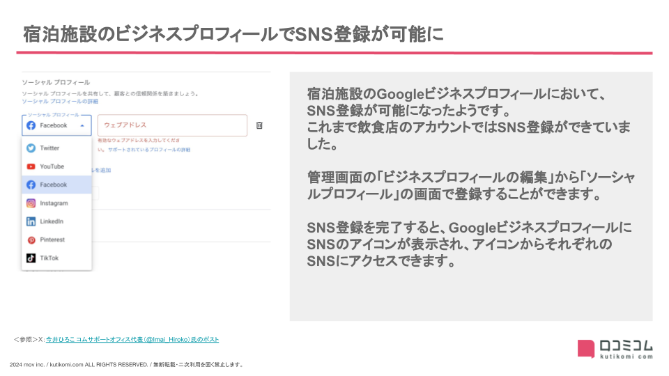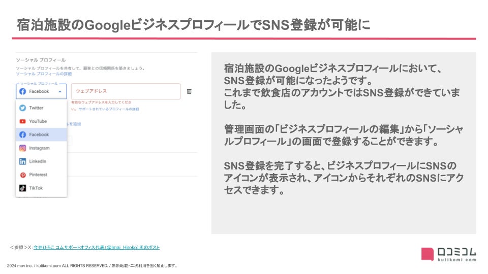 宿泊施設のビジネスプロフィールでSNS登録が可能に:最新の「Googleマップ・MEO」情報レポート【2024年3月版】を口コミコムが公開