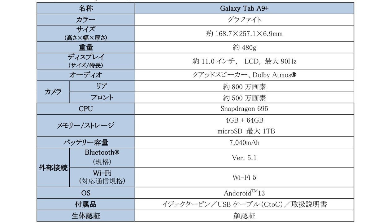 サムスン電子ジャパン株式会社は、韓国本社サムスン電子が本日2023年10月23日に発売を発表した最新タブレット「Galaxy Tab A9+」の 国 内 発 売 を 決 定 し、本日2023年10月23日(月)より販売開始いたしましたのでお知らせいたします 。 本 製 品 は 、 Samsung オ ン ラ イ ン シ ョ ッ プ( https://www.samsung.com/jp/offer/ )、世界最大級のショーケース「Galaxy Harajuku」(東京都渋谷区)、アマゾンジャパン合同会社(以下 Amazon)、主要 EC サイト、家電量販店にて販売中です。