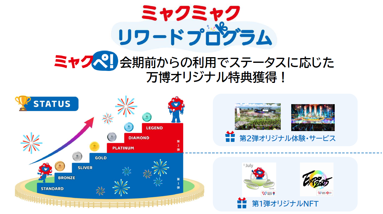 「ミャクペ!」や「ミャクポ!(株式会社りそな銀行が提供するポイントサービスの愛称)」を様々な場所で「つかう」・「ためる」ことにより利用者のステータスが向上し、ステータスに応じて「ミャクーン!(SBIホールディングス株式会社が提供する万博独自NFTの愛称)」や大阪・関西万博関連のオリジナルサービス・特典等が獲得できるプログラムです。プログラムを通じて「EXPO2025デジタルウォレットを使う楽しさ」を創出いたします。