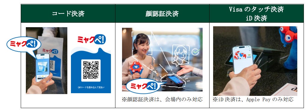 「ミャクペ!※1」は万博会場の内外を問わず利用可能な大阪・関西万博独自の電子マネーです。会場内ではQRコード決済※2に加え、「Visaのタッチ決済※3」や「iD※4」に対応した店舗で利用できます。さらに、会場外でも「Visaのタッチ決済」に対応した店舗や交通機関、「iD」に対応した店舗、Visaが利用できるECサイトにて万博の会期前からご利用いただける、便利で新しいキャッシュレス決済手段です。