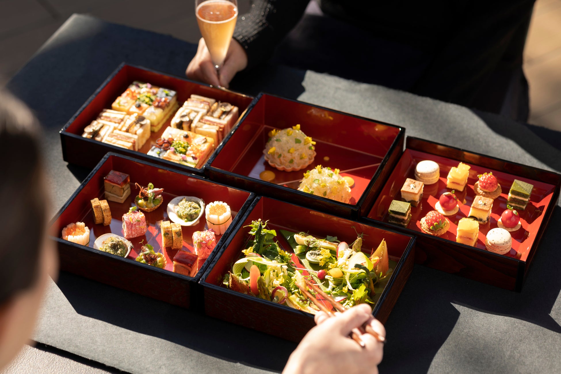 野がけ弁当は、春野菜や柑橘などの旬の食材をふんだんに使用し、星のや東京オリジナルの提げ重で提供します。提げ重とは、重箱、銘々皿、酒筒や盃などの酒器がひとつの箱に収められ、持ち運びできるように作られたものです。四季折々の物見遊山の際に重宝されたと言われています。本プログラムでは、実際に江戸時代に活用されていた提げ重を手直しして使用します。当時、行楽の楽しみといえば、野山で英気を養いつつ季節の味を堪能するお弁当でした。行楽に持っていくお弁当を「野がけふるまい」と言い、旬の食材を活かしたご馳走が詰め合わされています。星のや