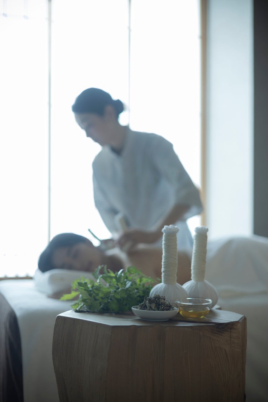 江戸時代、春の初め頃に行われていたのが草花や山菜を採集する「摘み草」です。摘み草には、野に出かけ春の光を浴びてリフレッシュするという目的があったと言われています(*2)。日本橋庭園で野がけをした後は、当時の野がけでよく摘まれていた蓬を使用したスパトリートメントを体験できます。蓬を練りこみ蒸しあげた葉玉で、身体を温かく包み込みます。蓬のさわやかな香りで春の野にいる気分を味わう、寛ぎのひとときです。