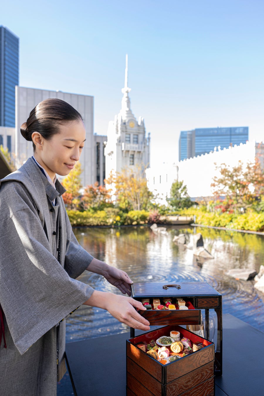 野がけ弁当を味わう場所は、「日本橋庭園」です。江戸時代に呉服店「越後屋」として始まった、日本橋三越本館の屋上に位置しており、中央にはビルの間に広がる都会の青空を映す鏡のような水盤があります。その周りに植えられているのは、水盤と調和した様々な樹木です。これらは日本橋三越本館の高さと皇居の標高が同じであることから、皇居の植生にならった植栽となっています。庭園の周りを見渡すと、高いビルが建ち並ぶ現代の風景も目に入ります。都心のビル群の中で、屋上だからこそ視界いっぱいに広がる空と緑の息吹を感じながらお弁当を楽しむ、江戸文化と現代の自然風景を掛け合わせた野がけです。特別に設えた席で、ここちよい春先の風と温かな日差しを浴びて、冬から春への移り変わりを楽しむことができます。