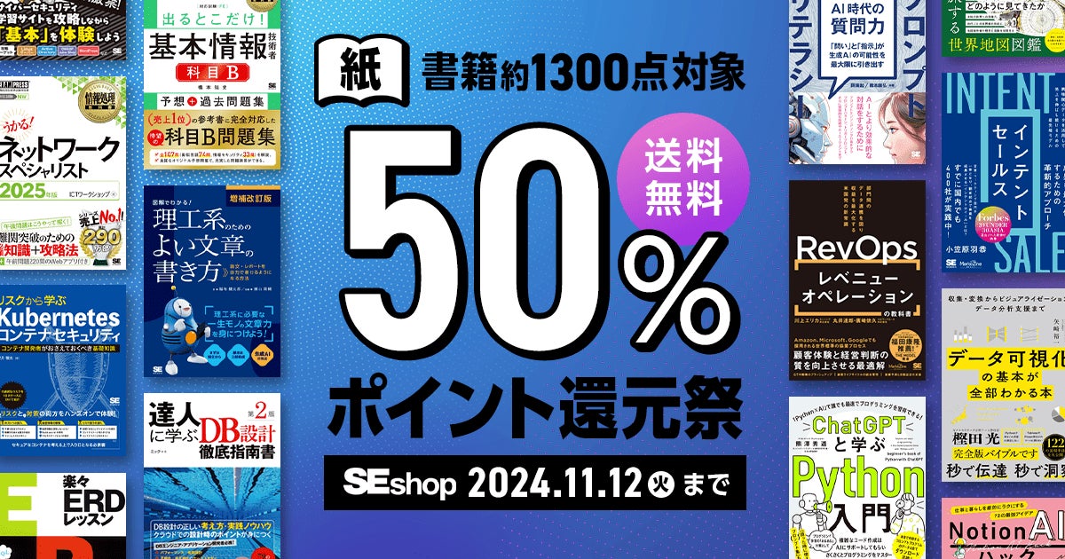 SEshopは、IT書・ビジネス書をはじめ、資格書や実⽤書まで幅広いラインナップを展開する翔泳社の公式通販サイトです。11月12日(火)まで、紙の書籍を購入すると、本体価格の50%をポイント還元するキャンペーンを開催します。1冊からでも送料無料でお届けします。一部新刊含む約1300タイトルが対象です。貯まったポイントは1ポイント=1円として次回のお買い物から使えます。
