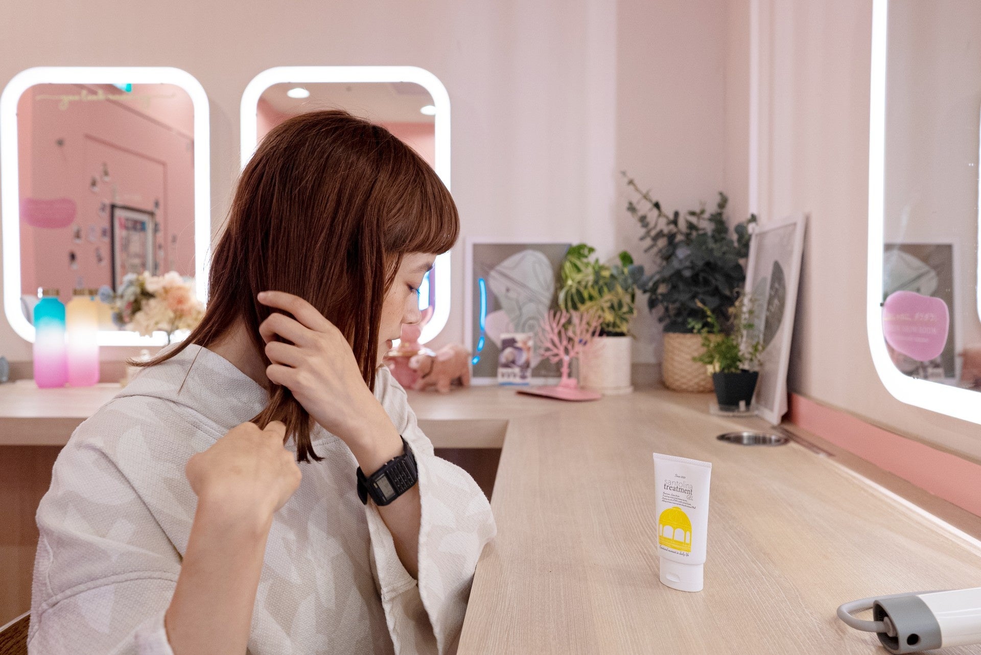 期間中は男⼥浴室にサントリナトリートメントを設置し、髪に塗布した状態でサウナ室をご利⽤いただけます。本製品は熱が加わることで、美髪成分が髪の内部へ浸透しダメージを補修します。サウナの熱で髪が痛むのでは?という不安から開放され、思う存分リラックスタイムをお過ごしいただけます。