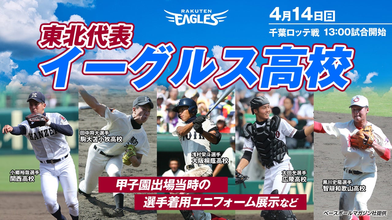 株式会社楽天野球団(本社:宮城県仙台市宮城野区、代表取締役社長:森井 誠之)は、「高校野球」に焦点を当てたイベント「東北代表イーグルス高校」を、4月14日(日)に初めて開催することとなりましたので、お知らせいたします。