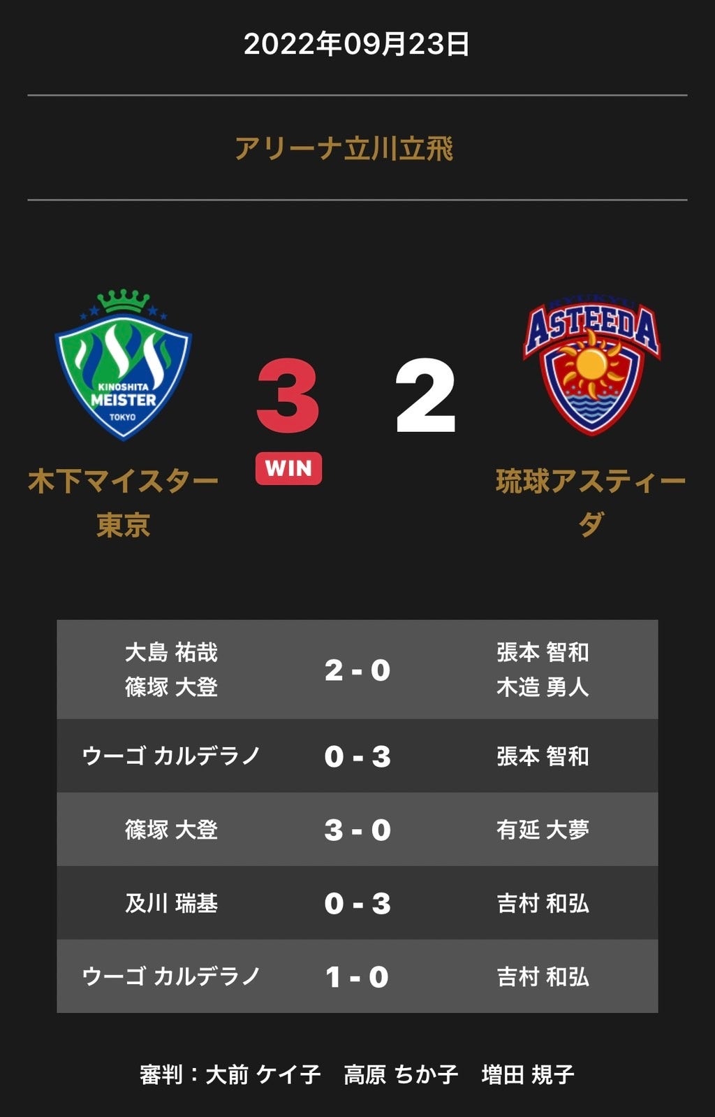 木下マイスター東京と琉球アスティーダの試合は3-2で木下マイスター東京が勝利しました。