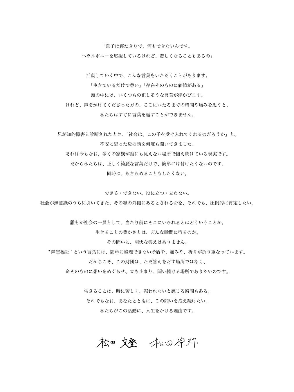 ヘラルボニー財団の創立には、株式会社ヘラルボニーの創業者である松田崇弥・文登が抱き続けてきた、「兄が幸せに生きる社会」を願う想いがあります。