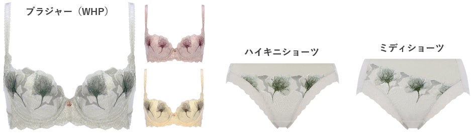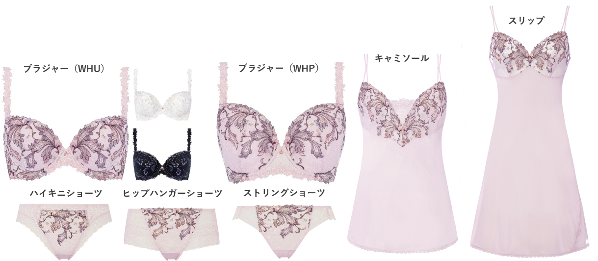 たとえ一瞬でもいいから、主役になって輝いてみたい――、女性が内側に密かに持つそんな願いをテーマにしたシリーズ。フラッシュの閃光を、立体的かつカラーコントラストをきかせたジャスミンの花の刺しゅうで表現しました。ブラジャー(WHU)は胸寄せ効果が期待できるパターンで谷間をきれいに演出。ブラジャー(WHP)は豊かなバストを自然なラインに整えます。