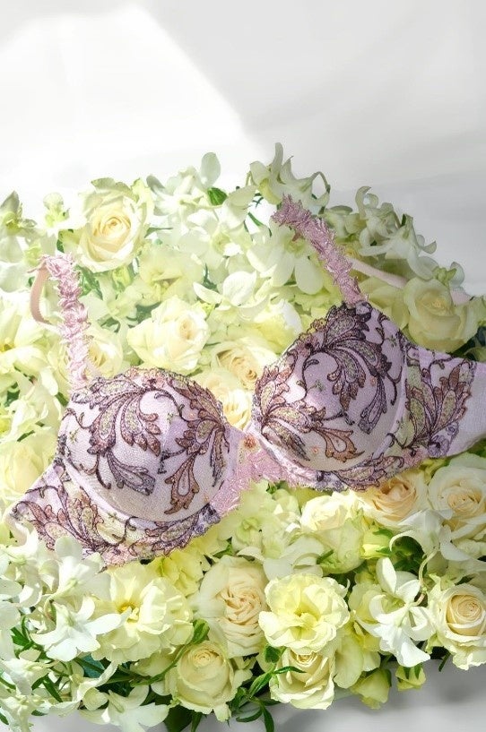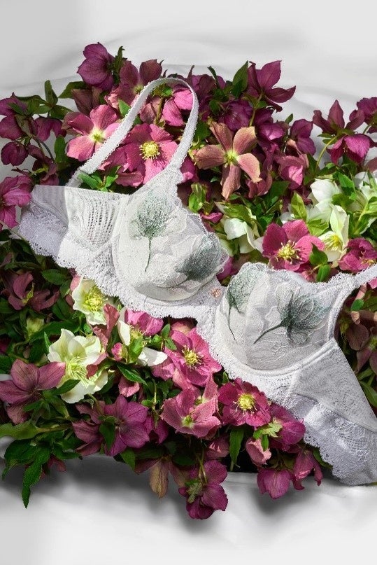 「私を忘れないで」の花言葉をもつクリスマスローズをモチーフに、心のときめきをやわらかいカラーグラデーションで表現しました。浮かび上がるようなタッチで描かれた花びらは、そっと触れたくなるような繊細さです。ブラジャー(WHP)は、バストトップをやや内側にし、リフトアップ効果が期待できるパターンを採用。ふっくらとしたデコルテをつくります。
