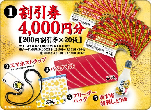 ■内容:①割引券4,000円分(200円割引券×20枚)②スマホストラップ③バスタオル④フリーザーバッグ⑤ゆず庵特製しょうゆ
