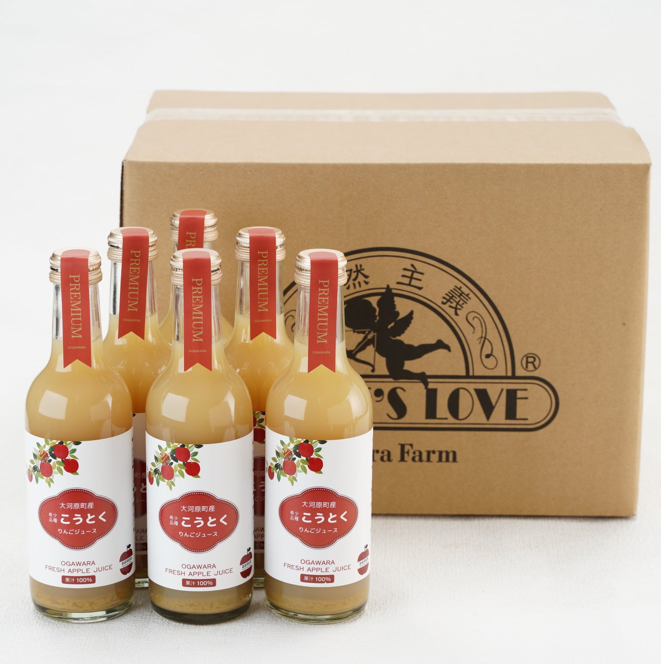 こうとくは蜜入りりんごと呼ばれるほどの圧倒的な蜜量のりんごで甘みが強く、芳醇で高級感のある香りです。栽培が難しいため生産量が少なく「幻のりんご」と呼ばれています。その「こうとく」と「ふじ」の2種類のりんごを、青森のりんごジュースの専門家の力をかり、それぞれのりんごの特性を生かした、100%のリンゴジュースを作りました。