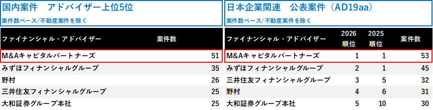 ・1位獲得「日本企業関連 公表案件 (AD19aa) 案件数ベース/不動産案件を除く」